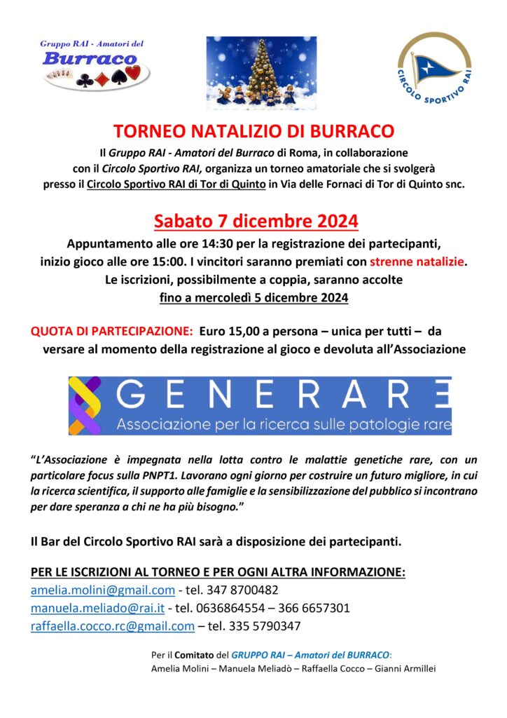 di Rai SeniorIl gruppo Rai Amatori del Burraco di Roma, in collaborazione con il Circolo Sportivo Rai, organizza un torneo...