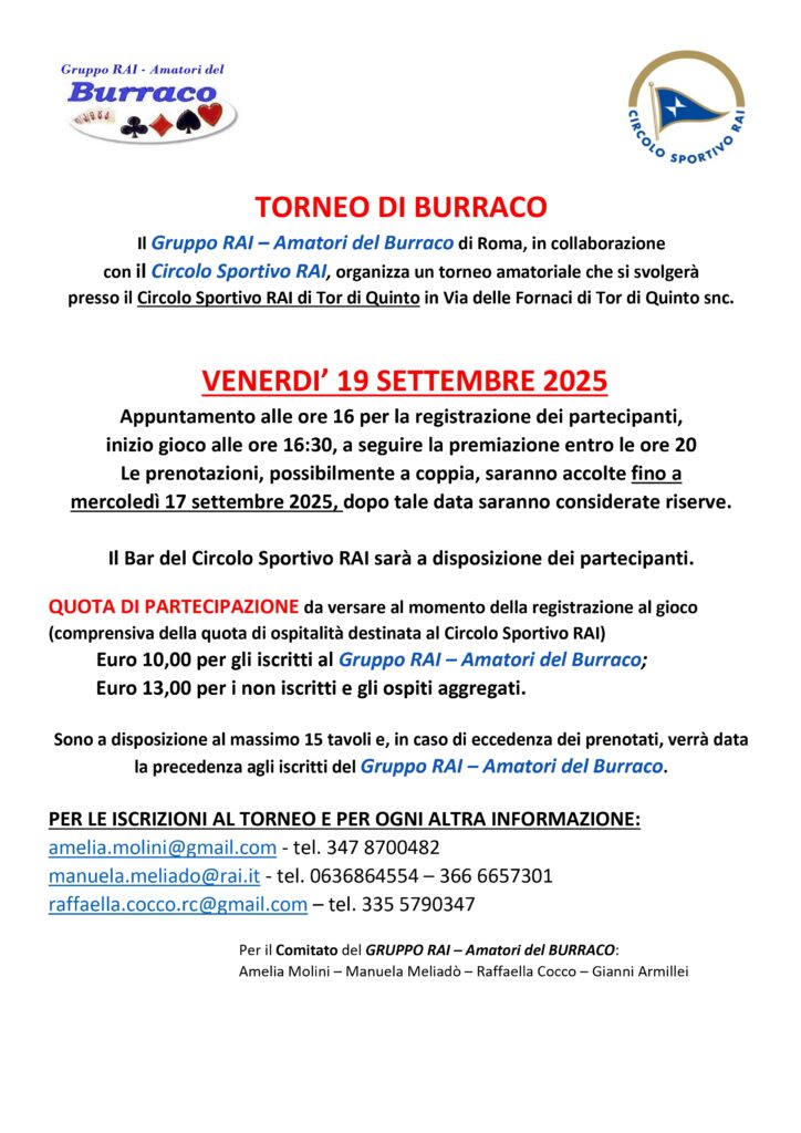 Il Gruppo Rai – Amatori del Burraco di Roma, in collaborazione con il Circolo Sportivo Rai, organizza per il giorno 19 settembre 2025 un torno di Burraco.