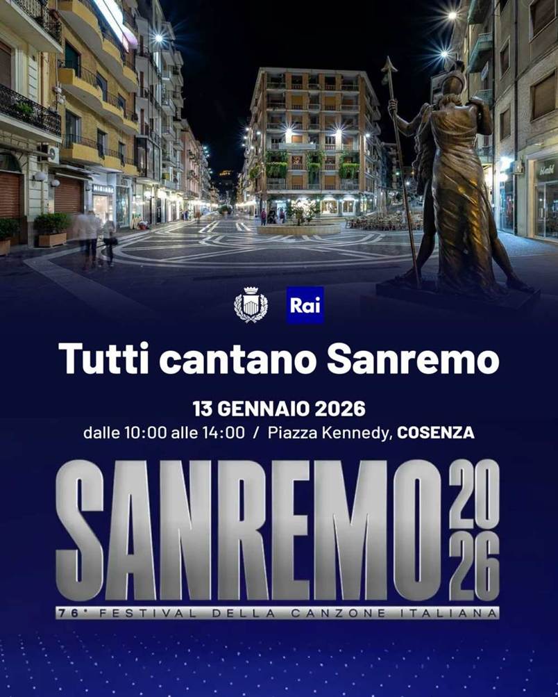 Cosenza è stata infatti selezionata insieme ad altre cinque città italiane per ospitare le riprese della campagna televisiva. L’iniziativa, con l’Orchestra del Conservatorio Stanislao Giacomantonio, renderà reale lo slogan “Tutti cantano Sanremo”, trasformando il set in un enorme palcoscenico collettivo. La campagna promozionale ufficiale del Festival, già in onda con i primi spot nel periodo natalizio, proseguirà poi per tutto il mese di gennaio e febbraio, sui canali Tv, Radio e sui social della Rai.
